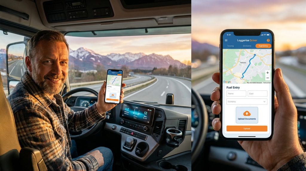 Sürücü Ali İstanbul → Almanya seferinde; çıkışta seferi başlatır, yakıt ve evrakları sahadan gönderir, sınırda durum günceller, teslimatta CMR/teslimat makbuzunu iletir ve seferi kapatır. Merkez tüm süreci anlık izler; evraklar arşivde, maliyet hesabı hazırdır.